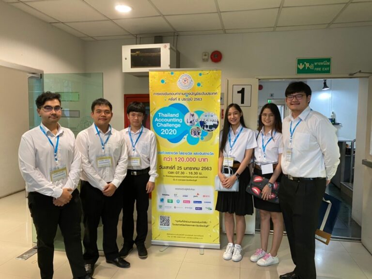 On January 25, 2020, six of our Bachelor of Accountancy program students, Mr. Wuttiporn Vegjadham (4th year), Ms. Rungpech Tareeratthakarn (4th year), Mr. Worayuth Srisaowaneekul (3rd year), Ms. Matchima Sriampai (3rd year), Mr. Piyapat Piyateerathitivorakul (3rd year) and Mr. Pera Chenkarnsuek (2nd year), participated in the Thailand Accounting Challenge 2020. The accounting challenge is conducted by the Federation of Accounting Professions (TFAC), under the Royal Patronage of His Majesty the King. It is the national accounting competition where  participants from both public and private institutions that offer Bachelor’s  Degree in Accountancy are invited. The competition was held for the eighth time and it is our second time that we have participated. Aj. Duangjai Ow-Jariyapithak, faculty member in the Accountancy program, enthusiastically supported the students to participate in the competition.