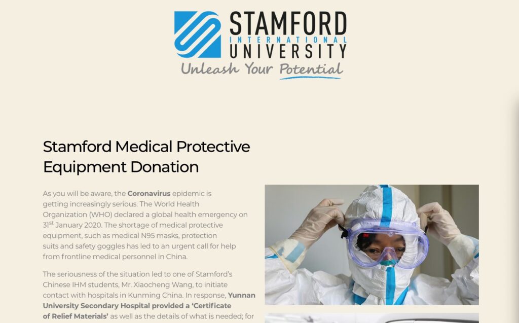 The seriousness of the situation led to one of Stamford’s Chinese IHM students, Mr. Xiaocheng Wang, to initiate contact with hospitals in Kunming China. In response, Yunnan University Secondary Hospital provided a ‘Certificate of Relief Materials’ as well as the details of what is needed; for example, the N95 masks need to be the specific medical variety. Other necessary paperwork such as a custom tax certificate also has been approved.