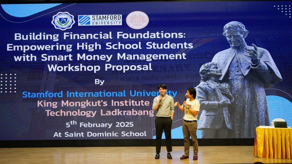 Recognizing the importance of financial education during high school, students from Stamford International University’s FIN311 Personal Finance course, in collaboration with the BBA International program at King Mongkut’s Institute of Technology Ladkrabang, led an interactive financial literacy session at Saint Dominic School on February 5, 2025. Sponsored by Vantage Markets, the session focused on essential financial topics such as budgeting, saving, understanding credit, and making informed spending decisions.